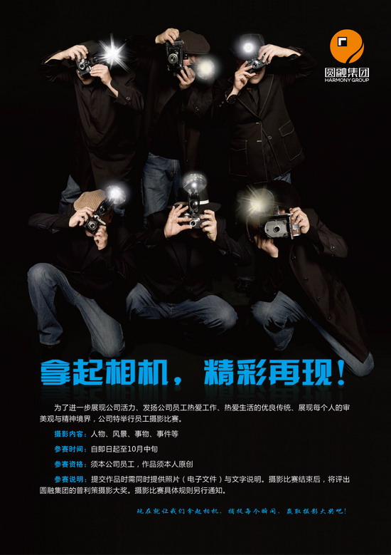 为了进一步展现公司活力,自即日起至10月中旬公司将举行员工摄影比赛。 本次摄影比赛内容题材包括人物、风景、事物、事件等各方面,参赛作品须为员工本人原创。摄影比赛结束后,将评出圆融集团的普利策摄影大奖。现在就让我们拿起相机,捕捉每个瞬间,去赢取摄影大奖吧!