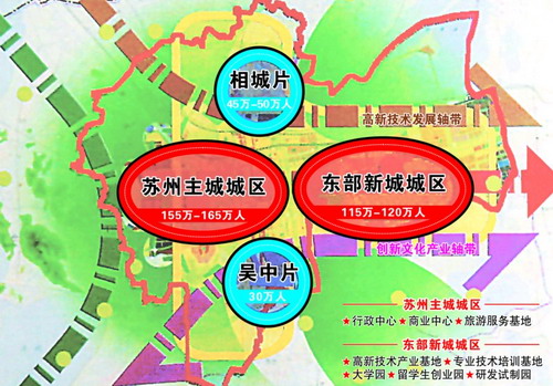 T轴指主城城区(古城和高新区)、新城城区(主要是园区)构成东西向横轴,相城和吴中片组成南北向纵轴;双城由主城城区和新城城区组成;两片指围绕吴中和相城形成的城市功能片区。