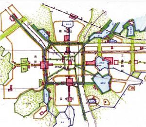 《总设》在城市结构与形态上确立了“十字轴带、五楔渗透、多心多点、绿廊相通”的城市总体空间结构,并以交通、功能、景观等系统,将各片区整合其中。同时,构筑市级中心(城市中心和城市副中心)、分片中心(包括各分片与专业中心)和居住区中心为主体的三级城市综合服务中心体系。