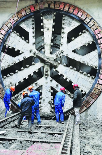 记者在现场看到,盾构机的机身主体目前仍在隧道内,工人们正在紧张地进行最后施工。