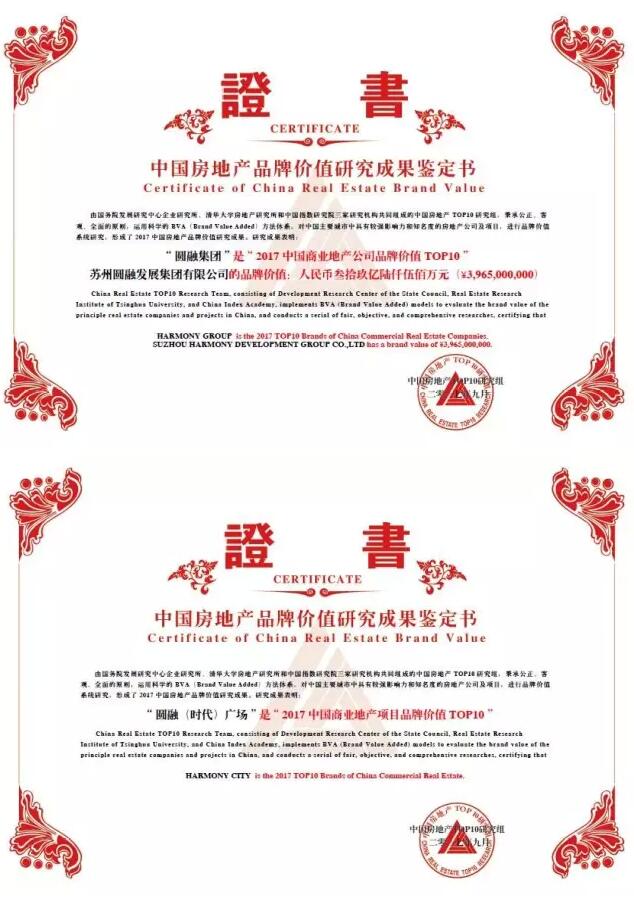2017年9月14日,“2017中国房地产品牌价值研究成果发布会”在北京雁栖湖国际会议中心隆重召开。本次发布会由国务院发展研究中心企业研究所、清华大学房地产研究所和中国指数研究院三家研究机构共同主办。在本次发布会上,华体网页版页面荣膺“2017中国商业地产公司品牌价值TOP10”称号。由圆融集团开发的圆融(时代)广场荣获“2017中国商业地产项目品牌价值TOP10”称号。