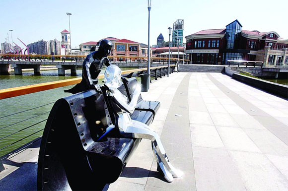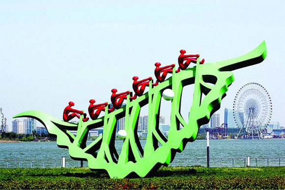 沿着水岸、向西拐入金鸡湖大道,宽阔的道路笔直通畅。金鸡湖南侧的望湖角上,颜色鲜艳的雕塑指引着新一段赛程,齐心划船、乘风破浪的景象代表着力与美的碰撞。富有生态教育内涵的望湖角公园一边湖光潋滟,一边绿草无际,静静等候着途经的参赛者们发现游目骋怀的惊喜。