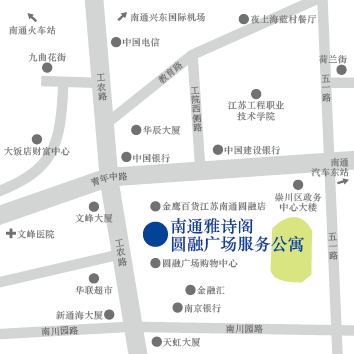 南通雅诗阁圆融广场服务公寓位于南通崇川区核心商圈内,临近濠河风景区。地理位置得天独厚、交通便利,从公寓步行即可到达圆融购物中心广场和特色文化商业步行街——九曲花街,同时周边围绕着各类金融机构、行政购物中心,满足住客的生活、工作和娱乐所需。