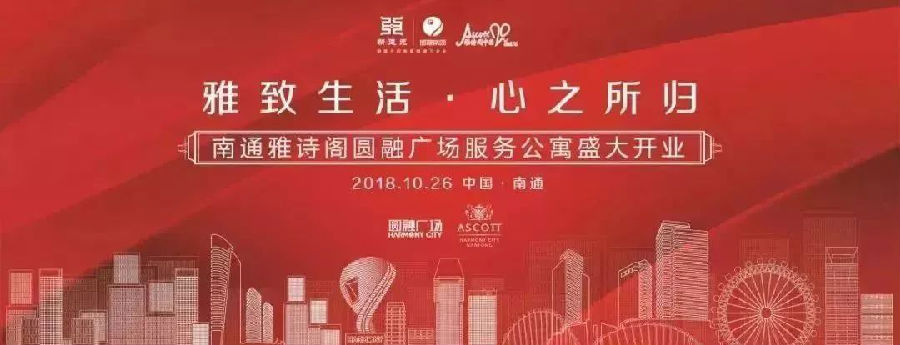 2018年10月26日,新建元圆融集团携手雅诗阁合作的酒店项目南通雅诗阁圆融广场服务公寓在南通圆融广场迎来盛大开业。新建元圆融集团领导及雅诗阁中国区领导出席了此次开业仪式。