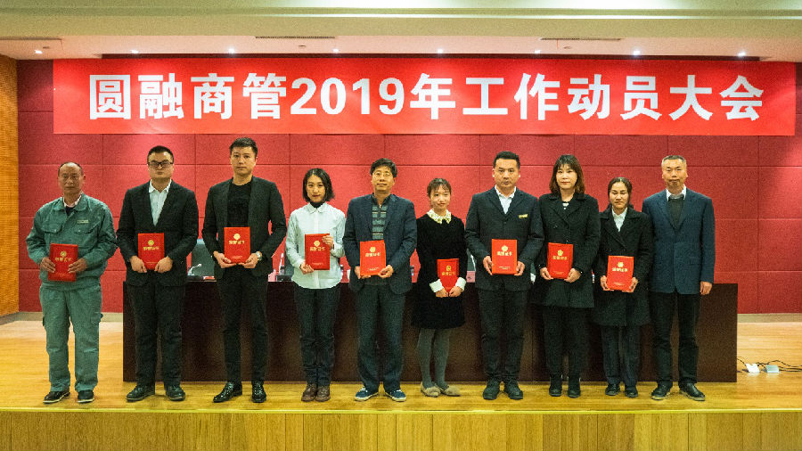 会上,圆融发展副总裁、圆融商管公司总经理张立刚做了2019年工作动员报告,报告全面总结了企业2018年度重点工作完成情况,分析了目前存在的问题以及今后的发展思路,结合圆融发展对商管公司的工作要求,部署了2019年重点工作事项,并对全体员工提出了解放思想、勇于创新等五点工作要求。贾顺宏副总经理宣读了表彰决定,圆融发展沈玉林副总裁及商管公司管理层向受表彰员工颁发了荣誉证书,并号召全体员工向先进学习,立足岗位,实现个人和企业的共同发展。圆融发展副总裁、圆融商管公司总经理张立刚与各部门、项目及分公司负责人签署了年度经营考核、党风廉政建设及安全管理等目标责任书。