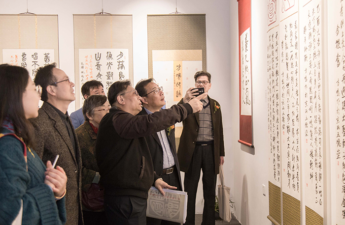 苏州大学社会学院副院长郑庚先生、苏州大学文正学院院长吴昌政先生、上海张江高科董事长刘樱女士、苏州市档案馆监督指导处副处长方玉群先生、苏州工业园区档案中心技术部主任金波先生、苏州市工商档案中心副主任吴芳女士、明美术馆馆长杨辉先生、李公堤项目总经理孙勇先生、中傲智能科技有限公司董事长张琳先生、东方兰台文化发展有限公司董事长闫阵宇先生、苏州国际发展集团书记顾金泉先生等嘉宾以及苏大师生、来自上海、昆山等地的朋友们和书法爱好者200余人出席了本次开幕式。