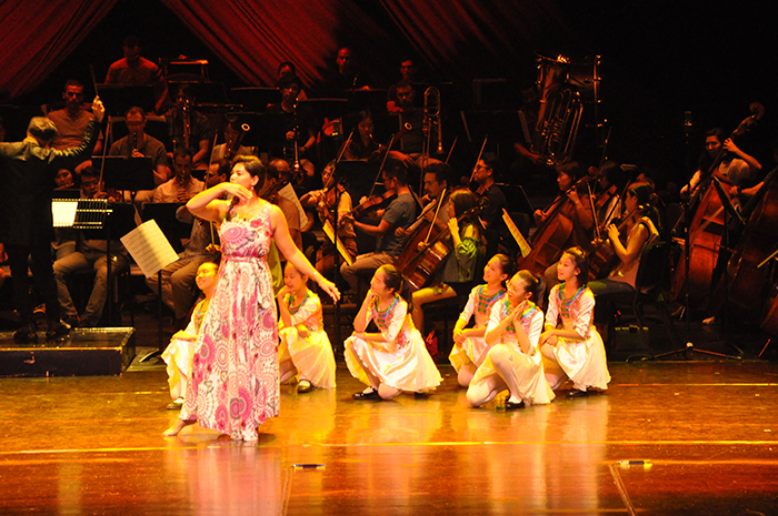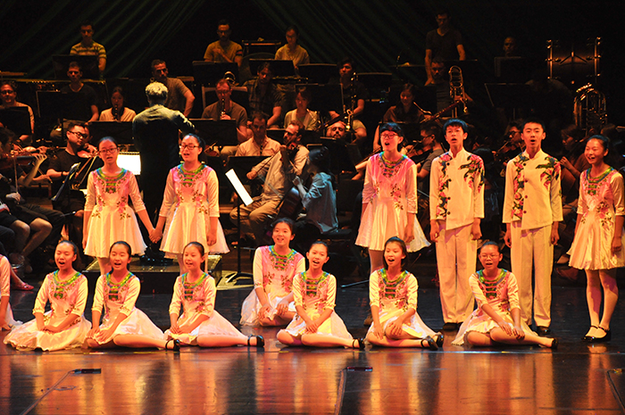 “月亮在白莲花般的云朵里穿行,晚风吹来一阵阵快乐的歌声⋯⋯”伴随着孩子们空灵、清澈的歌声与天真烂漫的微笑,整场演出由艺术团合唱曲目《听妈妈讲那过去的事情》、《让我们荡起双桨》拉开帷幕。孩子们不仅演唱了歌曲,还参与了其他外国歌唱家演唱的伴舞,受到了现场观众的热烈欢迎。孩子们的参与让节目更加灵动多彩。