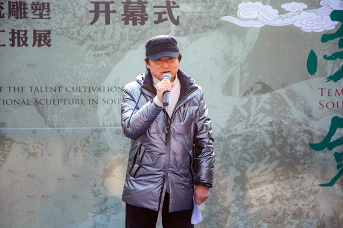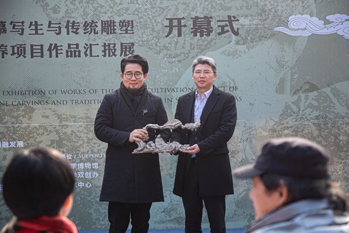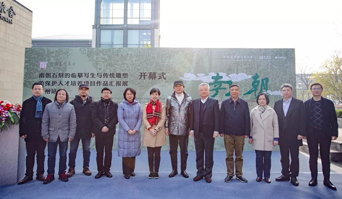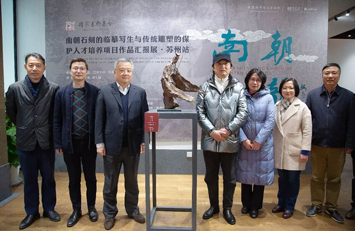 南京大学雕塑艺术研究所李岩将石刻作《月下松涛醉——陶渊明》赠与圆融艺术中心永久珍藏。最后,由在场领导和艺术家共同剪彩,见证“南朝气韵——南朝石刻的临摹写生与传统雕塑的保护人才培养项目作品汇报展·苏州站”正式拉开帷幕。