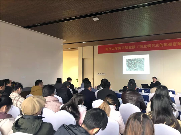 除了精美的雕塑展览外,江苏省书法家协会副主席、江苏省直书法家协会主席、南京大学教授、硕士研究生导师黄正明还在现场为大家带来《南北朝书法的笔墨意蕴》学术讲座。