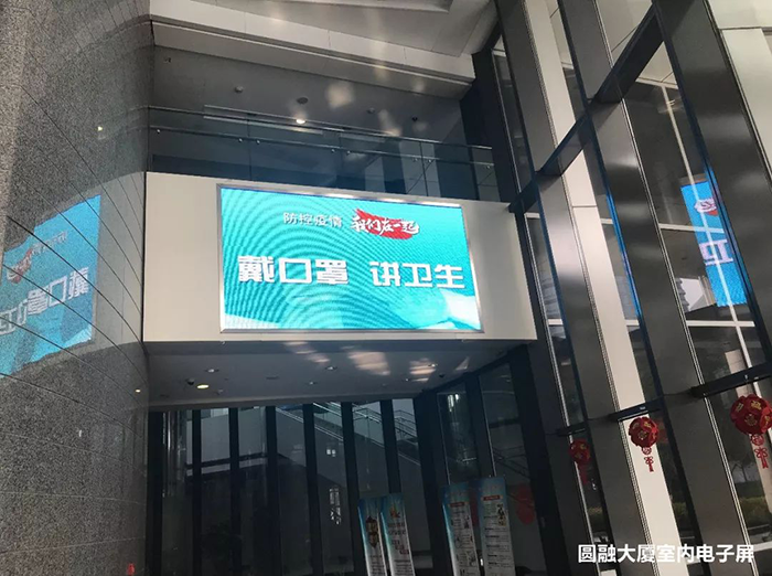 汇金大厦、圆融大厦利用室内电子屏集中播放防控宣传海报;