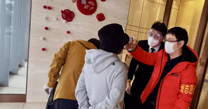 2月2日,圆融发展朱柏亭在苏州中心8号酒店式公寓配合物业对居民及访客进行体温检测,并对人员往来地情况进行排查。