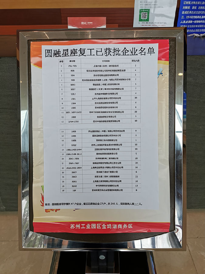 2月8日晚,园区公布《关于进一步做好新型冠状病毒感染的肺炎疫情防控期间商务楼宇和载体安全有序复工与 疫情防控工作的通 知》,明确了写字楼楼宇主体的复工申报和楼内企业复工申报的流程。星座客服部连夜进行工作部署,就复工流程与资料要求进行内部培训,次日早8点开始对楼内企业逐户通知,当日11:00,写字楼客服部完成了共计97家企业的复工申报通知。当日同时提报了圆融中心的整体复工资料。