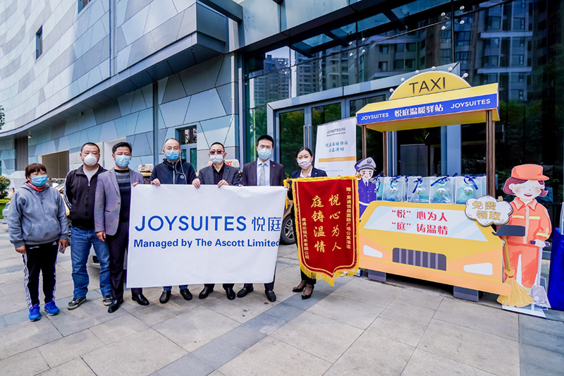 南通悦庭圆融广场公寓酒店作为新建元圆融发展与凯德集团成员雅诗阁有限公司在南通地区继南通雅诗阁圆融广场服务公寓后合作的第二家精品公寓。自从疫情爆发以来,在业主方新建元圆融发展与雅诗阁团队的密切配合和高度重视下,2家公寓每天都对进出住客进行体温测量并做好登记。电梯以及公共设施每2小时进行消毒,大堂张贴了防疫指引。而这一次的公益活动不仅仅是为了慰问和援助一线的工作人员,更是旨在让大家意识到疫情好转并不等于危险解除,疫情的全面防控还需要我们每一个人携手并肩,共同努力!