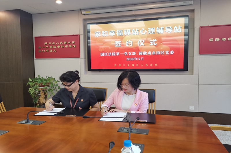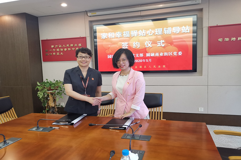 5月26日上午,苏州工业园区人民法院与新建元圆融商业街区党委举行共建签约仪式,标志着双方党建合作项目“‘家和’心理辅导站”正式落地新建元圆融商业街区党群服务中心。