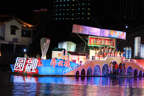 在圆融号彩船上,一座长长的拱桥,以气贯长虹之势,凌波金鸡湖之上。一桥飞架,将粉墙黛瓦的江南风情和高楼林立的现代园区风情巧妙融为一体。桥洞由彩幕组成,璀璨夺目。桥身化身为一座天然的世界舞台,不同肤色、不同国籍的中外友人届时将倾情献演。桥的原型取自于苏州市区第一个“国字号”的中国特色商业街——李公堤。这条总长2200米的大堤由清代李超琼初建,在历史基础上开发建设,目前已成为一条集购物、餐饮、休闲、娱乐、旅游、文化为一体的景观休闲商业街区。每当夜晚来临,李公堤流光溢彩,金鸡湖天上人间。