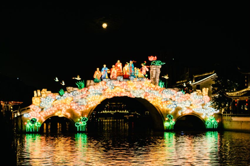 本次活动以“跨越山海 万物热爱”为主题,选取了中国传统神话故事中反映积极向上,能够鼓舞人心的神话传说和能够体现中国传统文化的人文理想或安居乐业的美好愿望的这两类题材进行设计制作。通过灯光亮化布置,将苏州灯彩与苏式园林建筑相融合,形成了一种穿越时空,美轮美奂的场景体验;既保持了苏州灯彩“精、细、美、巧”的艺术特色,又结合了斜塘老街街区特点,融灯于景,情景交融。斜塘河畔的桨声灯影,让人仿佛又回到了数百年前“月与灯依旧”的繁华盛景。