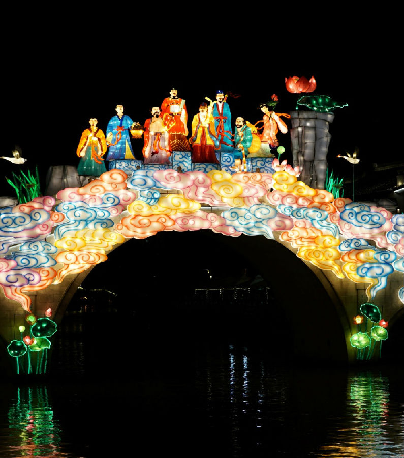 已经76岁高龄的苏州灯彩项目国家级非物质文化遗产代表性传承人—汪筱文老师带着他平均年龄超50岁的制作团队,经过3个多月的设计制作,在斜塘河畔再次呈上了一个个苏州灯彩的精心之作。长24米的主景灯“八仙过海”灯组取材于耳熟能详深受喜爱的八仙故事,八位神仙大咖造型各异,脚踩祥云乘风破浪,动感十足栩栩如生。水中的倒影更是色彩斑斓,相映成趣,远远望去十分震撼。