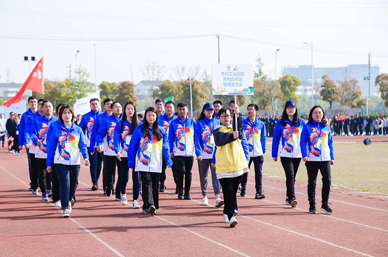 早上8点20分,开幕仪式正式开始。开场节目展演围绕新时代全民健身运动的要求,结合苏相合作区全民健身体育文化特色,融入太极拳、船拳、腰鼓、啦啦操等多种体育运动元素,精彩纷呈地展现了苏相合作区全民健身运动蓬勃发展的风采。随后,伴随着激昂的运动员进行曲,这次运动会的“主力军们”迈着轻快的步伐喊着响亮的口号进入会场。本次运动会包括苏相合作区管委会、漕湖街道办事处、苏相合作区开发公司、漕湖学校、漕湖街道社区卫生服务中心、苏州市公安局相城分局漕湖派出所、吴通控股等在内的32支代表队方阵依次入场。