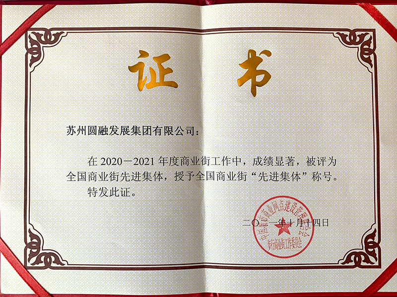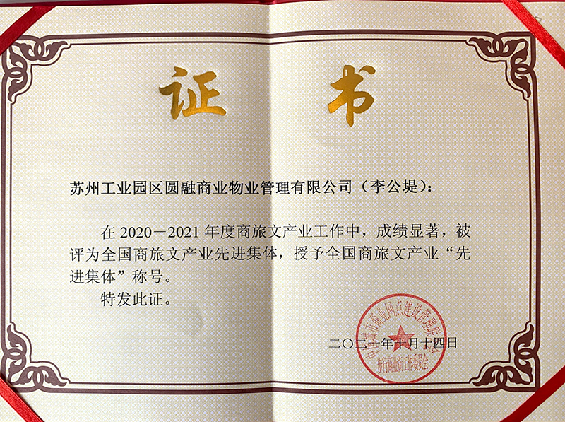 在本届西宁年会上,中国商街委还向 2020-2021 工作年度在商业街行业与商旅文产业工作中,做出突出贡献的“先进集体”和“先进个人”进行表彰。华体网页版页面荣获全国商业街“先进集体”称号,苏州圆融商管公司(李公堤)荣获全国商旅文产业“先进集体”称号。