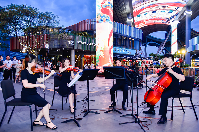 花灯初上金鸡湖,天幕花开伴歌舞。6月23日晚,由苏州工业园区国资党委主办,新建元集团党委、新时代集团党委协办的献礼“七一”快闪活动在圆融时代广场天幕“时代小剧场”成功举办,获得了往来市民游客的点赞和好评。《我和我的祖国》、《瑶族舞曲》,一首首经典名曲以弦乐四重奏的形式在夜晚的圆融天幕下奏响,乐声悠扬动听,吸引了大批街区市民的驻足欣赏。在美妙的弦乐演奏中,围观群众纷纷陶醉其中,并自发踊跃地加入到了合唱的队伍中来。