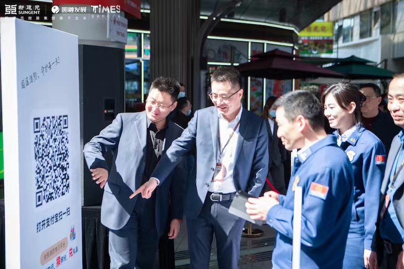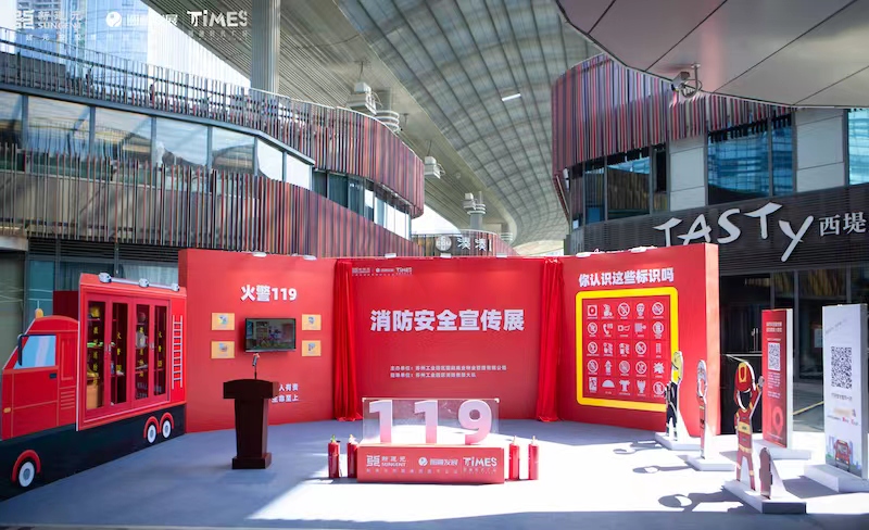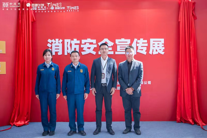 活动现场,苏州工业园区消防大队大队长孙星、苏州工业园区消防大队参谋柏佳棋、圆融商管总经理方刚、圆融时代广场项目总经理何志岗共同为此次消防安全宣传周进行揭幕。