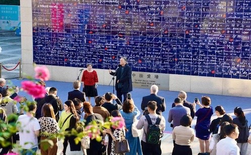 在首届苏州金鸡湖中法文化艺术周中,“中法爱墙” 落户李公堤,成为环金鸡湖区域文化“打卡”新亮点,也成为中法艺术交流的新纽带。开幕式活动上,法国“爱墙”艺术家贝隆和克莱赫·吉多介绍了“爱墙”的创作故事,街画艺术家齐兴华介绍了作品《龙凤呈祥》的创作故事。