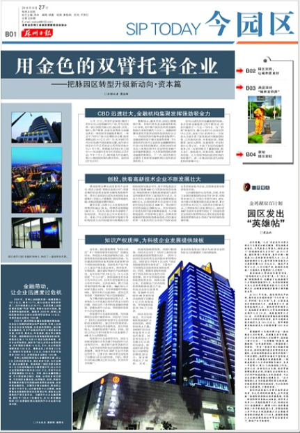 5月 27日,中国平安保险(集团)苏州公司入驻圆融时代广场,作为全国第一家以保险为核心的,融证券、信托、银行、资产管理、企业年金等多元金融业务为一体的综合金融服务集团,一举买下了时代广场N2B整栋办公楼,投资规模达到3.6亿元;同一天,恒丰银行苏州分行也落户园区星海大厦,成为该行南京分行在江苏省设立的首家异地分行;6月下旬,香港最大的独立本土银行——东亚银行苏州分行在园区正式开业;今年7月6日,韩国最大的金融机构——韩国国民银行落子苏州,也在园区开出分行。