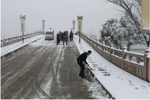 风格各异的桥是李公堤商业街的一大特色,起伏的桥面、深深的积雪给驾驶员的车技带来了不小的压力。因此,参与扫雪的同事们将清扫的重点放在了4座桥上,大家不畏严寒,将上桥、下桥处的积雪清扫得干干静静,很多女同事虽然以前没有干过这么繁重的体力活,但依旧坚持了下来。通过一个上午的努力,李公堤商业街的道路积雪被基本清理干净,为过往行人车辆的通行安全创造了良好的环境。在雪花的装扮下,今夜的李公堤将更具魅力,广大市民可以放心地驾车前往这里,品美食、赏雪景。