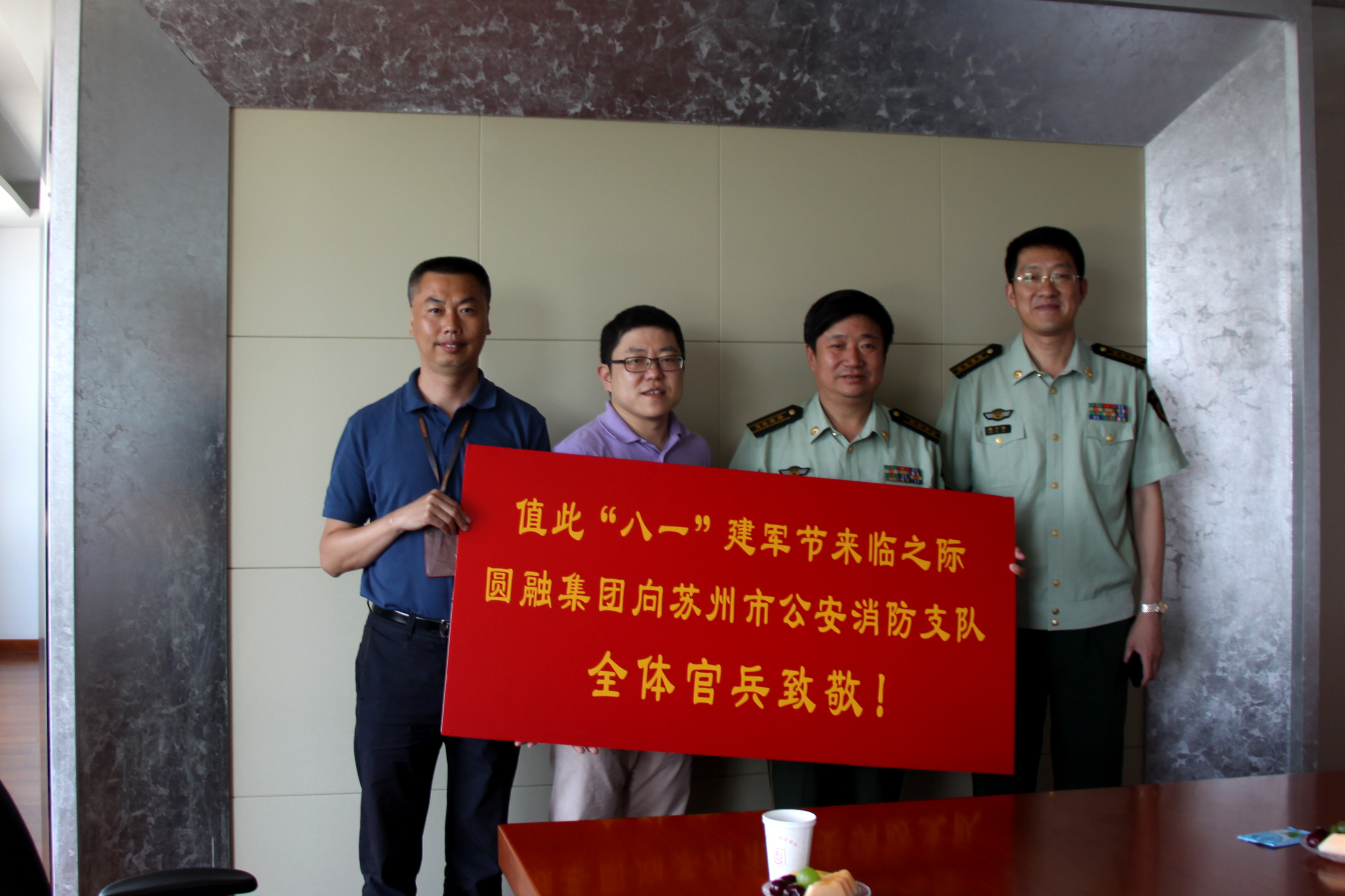 在中国人民解放军建军85周年即将来临之际,2012年7月31日下午,圆融集团副总裁曹翔、总裁助理一行走访慰问了苏州市公安消防支队,代表集团向坚守在一线的全体消防官兵致以诚挚的节日问候。