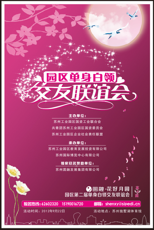 由园区国资工会、共青团园区国资委、园区企业社会责任联盟主办,圆融集团独家冠名的圆融·花好月圆—园区第二届单身白领交友联谊会将于9月22日在苏州独墅湖体育中心举行。