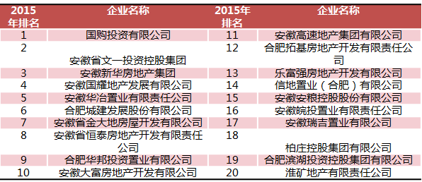 2015中国房地产开发企业安徽省20强