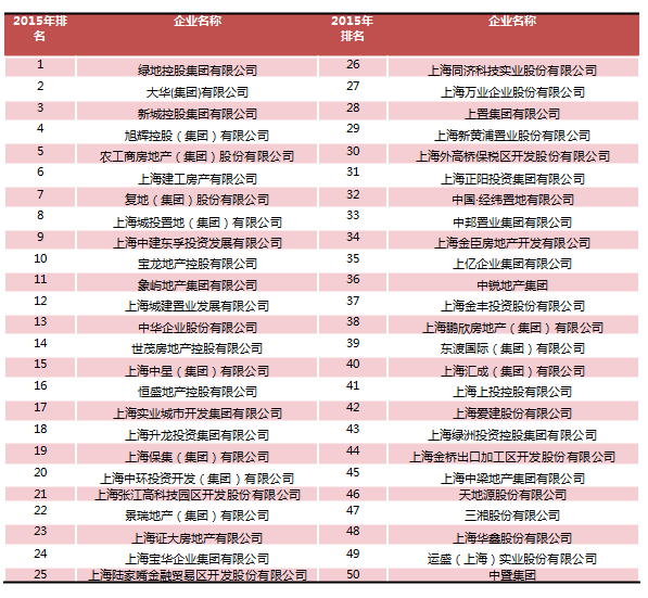 附:2015中国房地产开发企业上海市50强