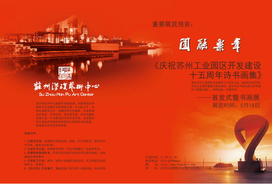 值此苏州工业园区开发建设十五年之际,由政协苏州市委、苏州工业园区管委会联合编辑、荟萃诗文书画名家之作而成的“庆祝工业园区开发建设十五周年诗书画集”——《圆融乐章》首发式暨书画展将于5月18日,在苏州工业园区的李公堤汉璞艺术中心举办。